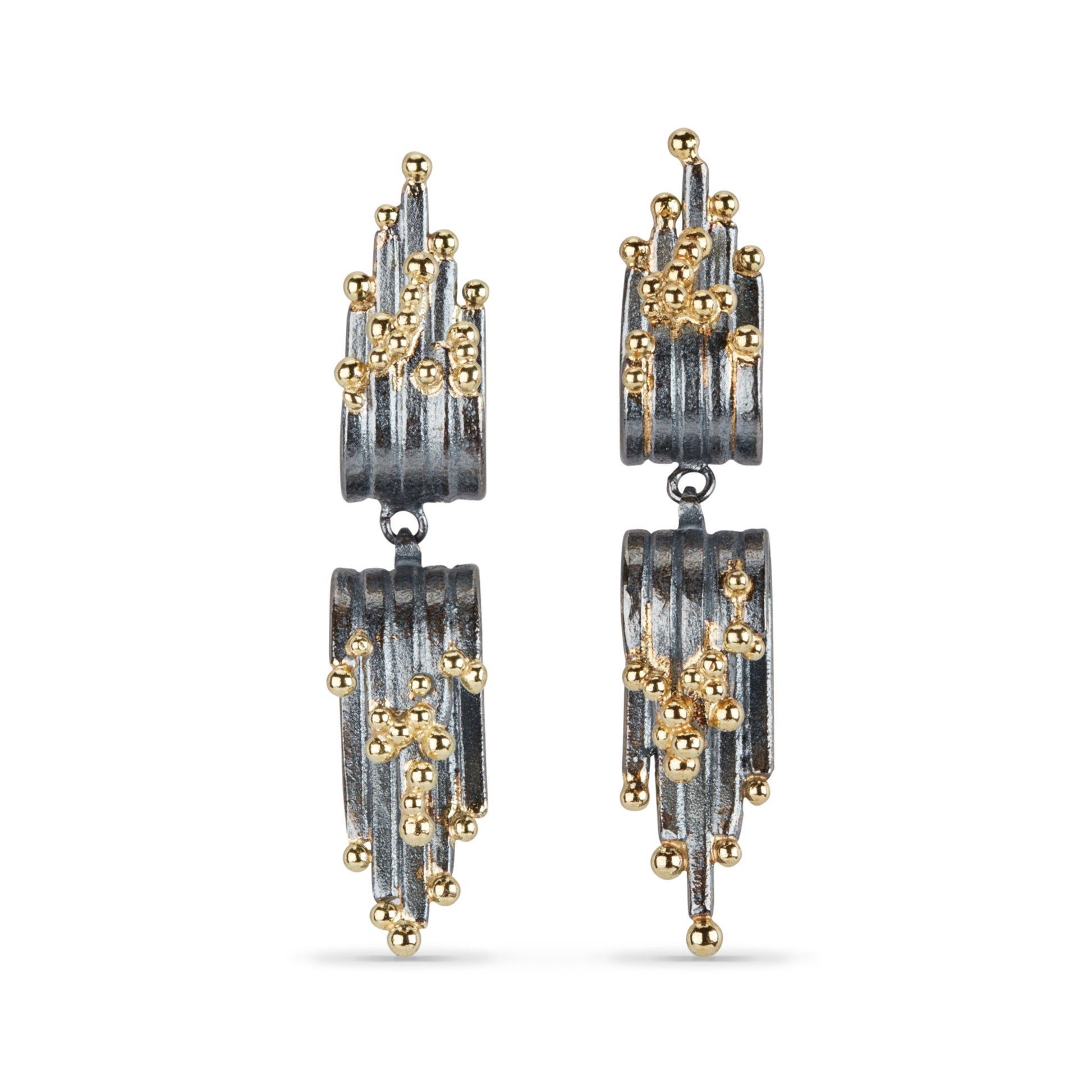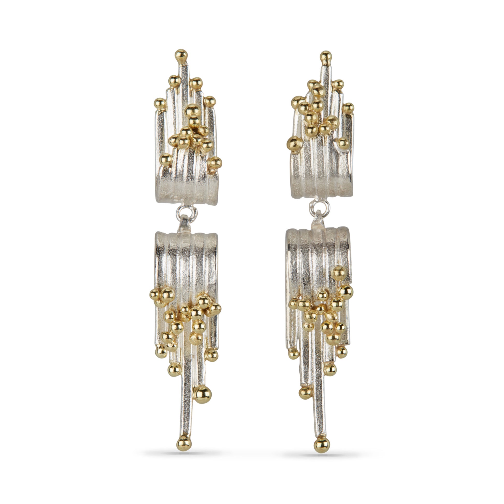 Stunning sculptural drop earrings, with two interconnected curls of silver cascading with 18ct yellow gold granules.