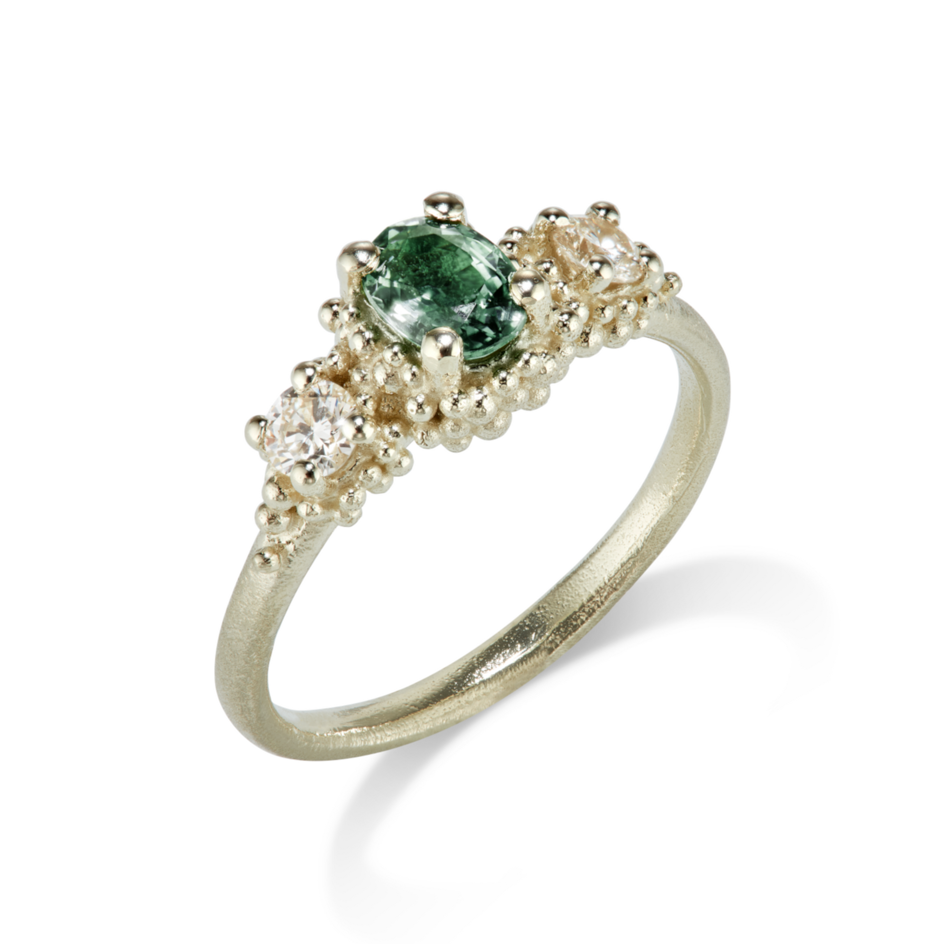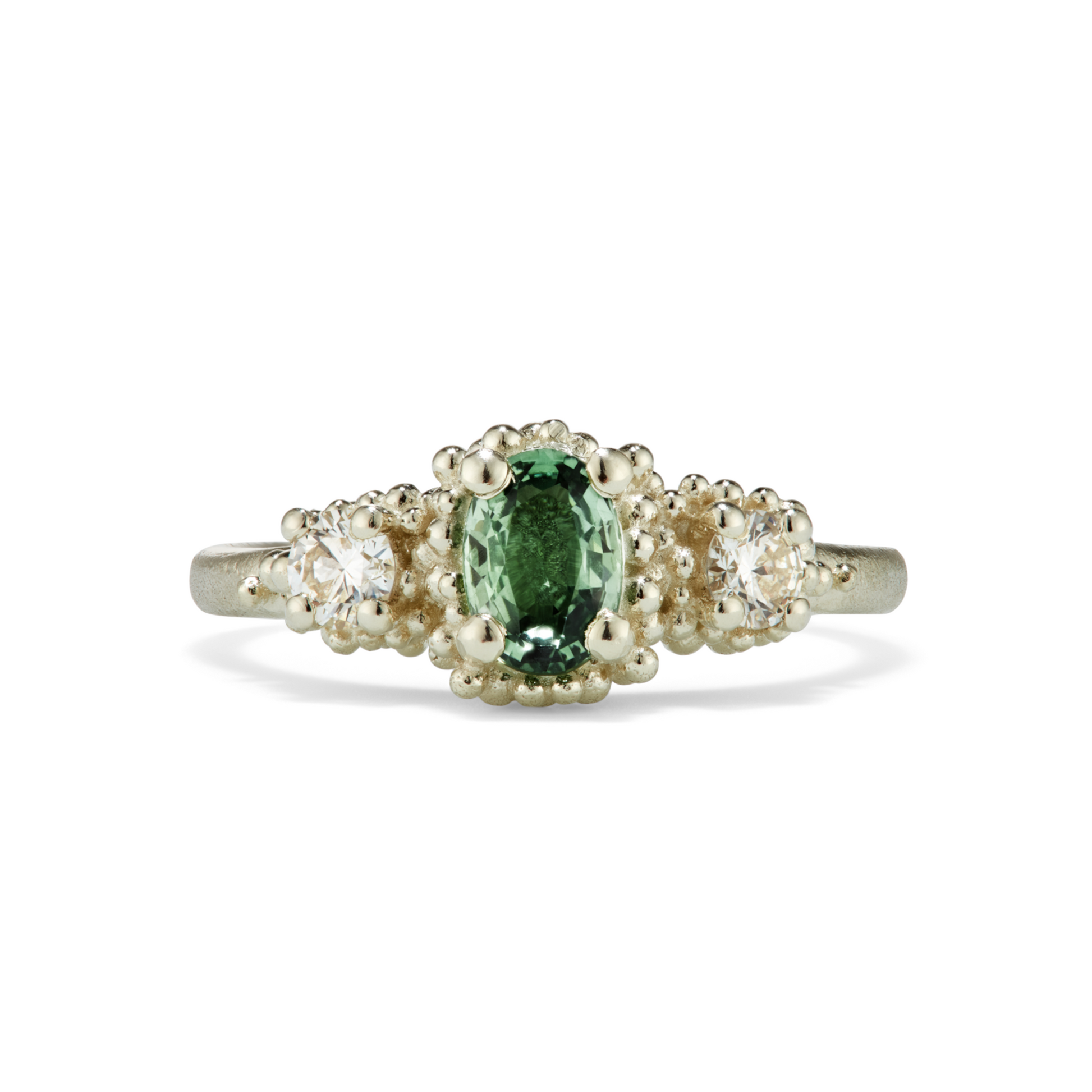 A beautiful soft green oval sapphire is nestled between sparkling diamonds and white gold granulation.
