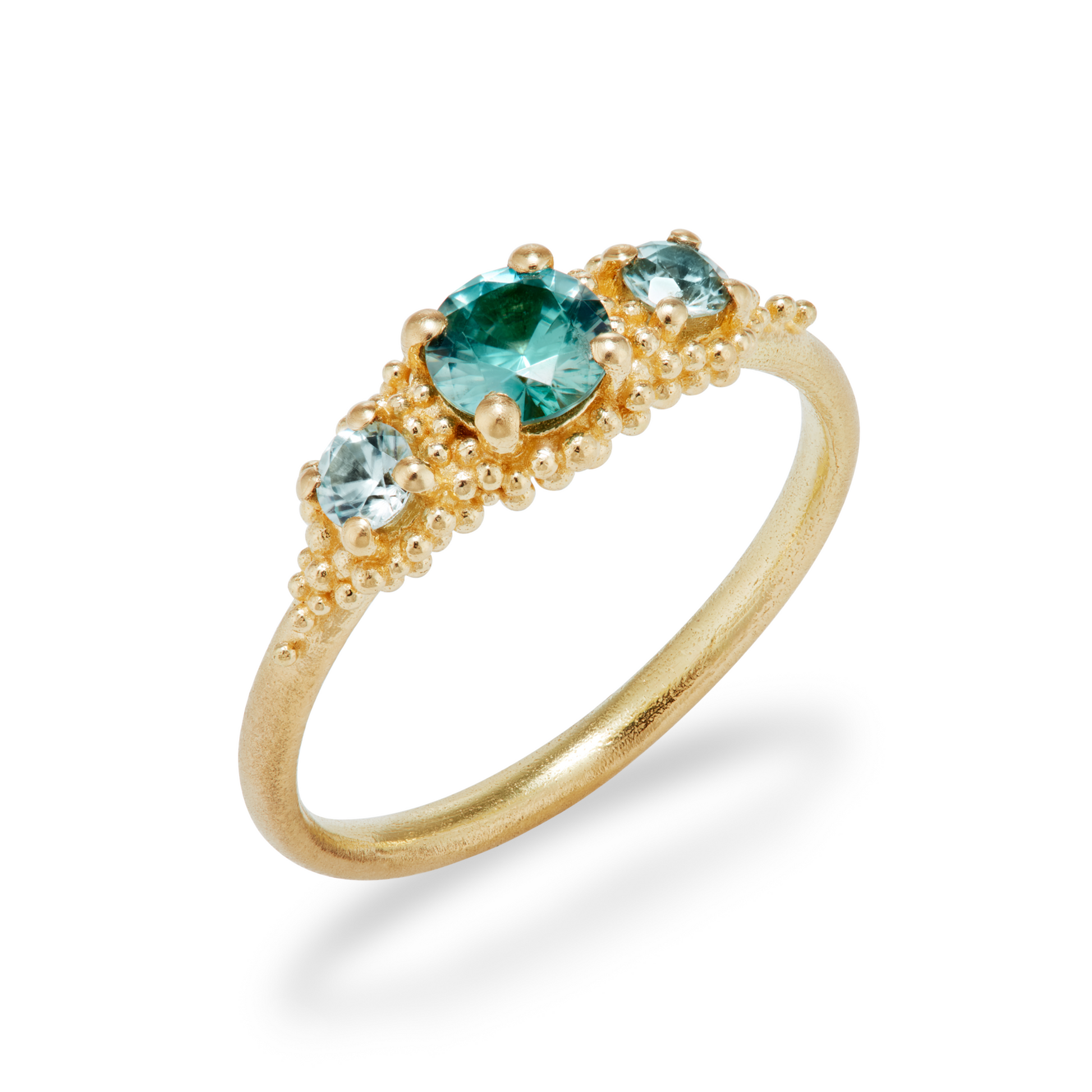 A trio of vibrant blue zircons are nestled in yellow gold granulation.
