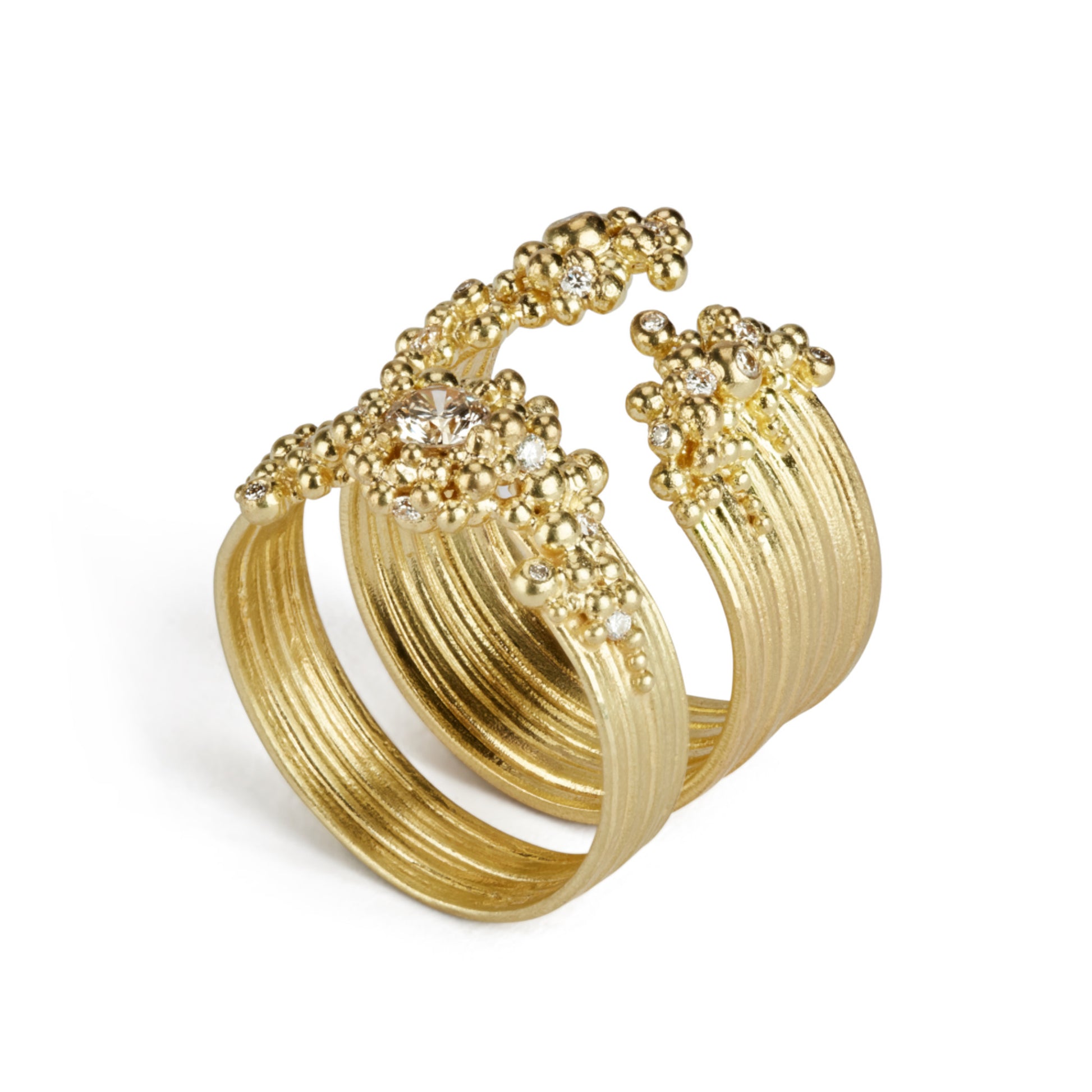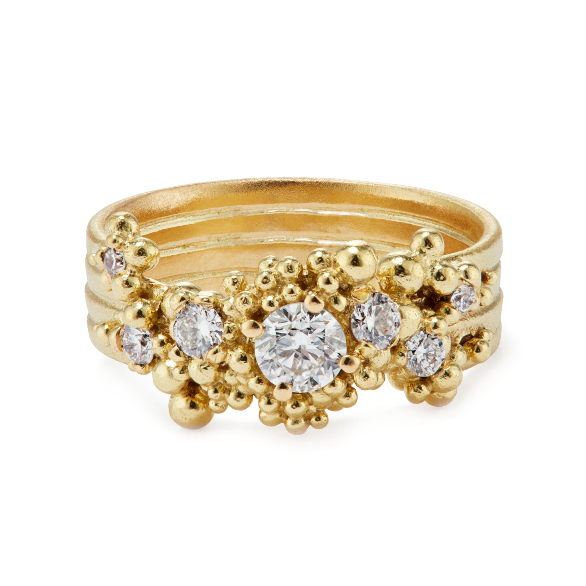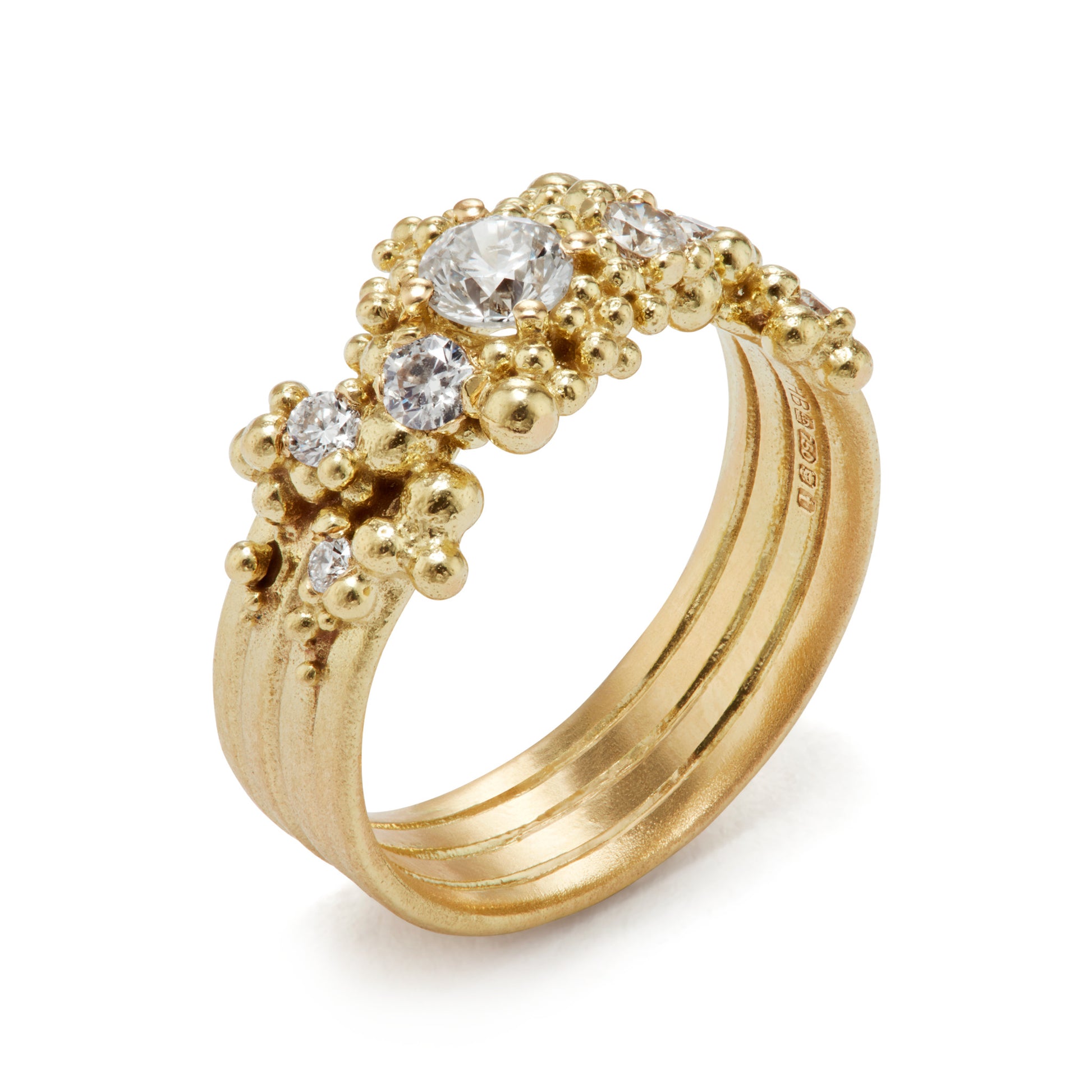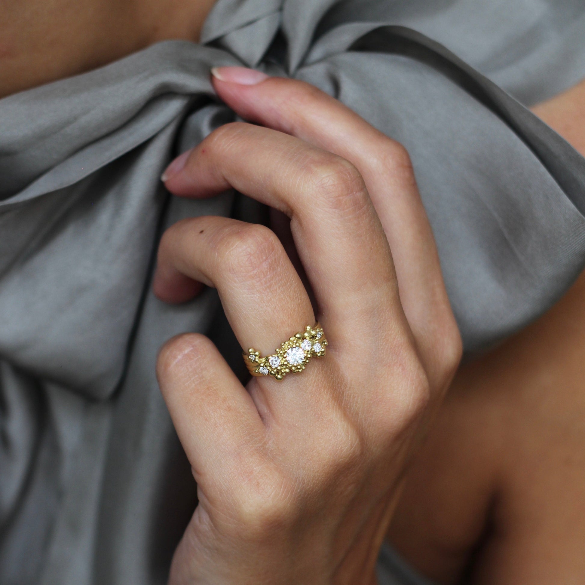 Voted as The Independent's "Best Buy" Alternative Engagement Ring. A whorl of 18ct gold granulation flows around this beautiful central diamond, set within a froth of shimmering diamonds and golden granules.